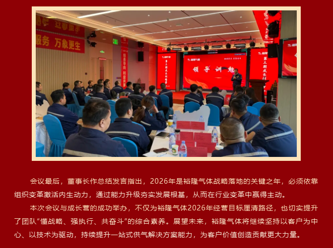 1月31日至2月2日,裕隆氣體2026年經(jīng)營(yíng)工作會(huì)議暨第三期成長(zhǎng)營(yíng)隆重舉行。公司各中心、分子公司負(fù)責(zé)人、核心骨干齊聚一堂,通過為期三天的高強(qiáng)度、高密度議程,全面復(fù)盤過往、規(guī)劃未來,進(jìn)一步明確戰(zhàn)略路徑,強(qiáng)化團(tuán)隊(duì)能力提升,為公司2026年高質(zhì)量發(fā)展奠定堅(jiān)實(shí)基礎(chǔ)。